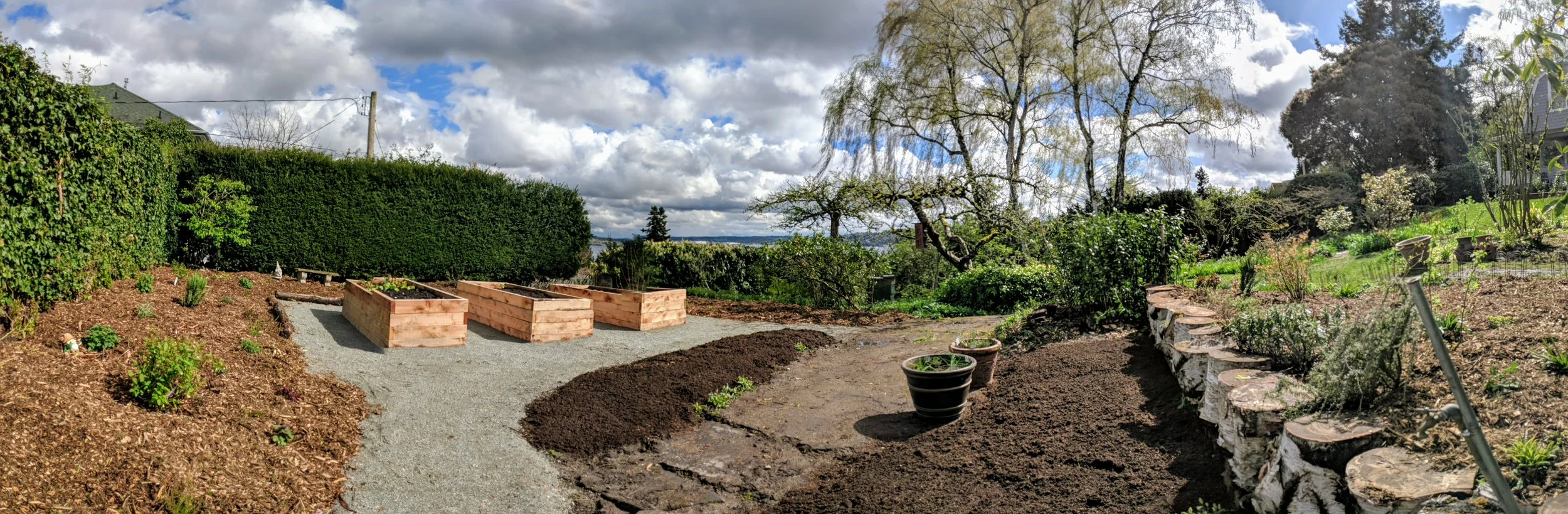With a large existing garden the new homeowner was looking to add rainwater harvesting, edible plantings and raised beds to annual vegetable gardening. We installed three separate cisterns to maximize the RainWise rebate and create a total rainwater capacity of 890 gals. Juniper was utilized for the large raised beds for its natural rot resistance and rustic aesthetics. A blend of native and edible species were planted with a heavy laver of arbor chips and cardboard to naturally suppress weeds.